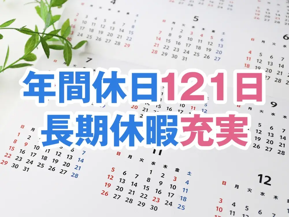休日・休暇 | ◎年間休日121日◎ 毎週土曜、日曜(ほぼ完全週休2日制) ※休日出勤はシフトにより2週間に一回程度お願いします。 ・年末年始休暇 ・有給休暇 ・慶弔休暇 ・GW ・お盆休暇 ※長期休暇は休日出勤シフトはありませんのでゆっくりお休みいただけます。 |